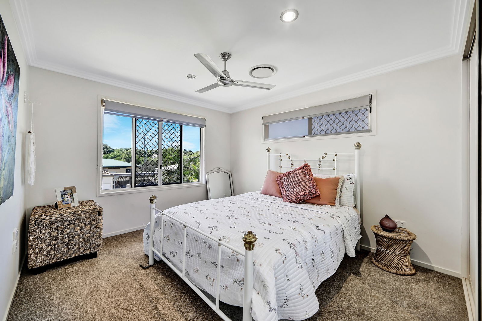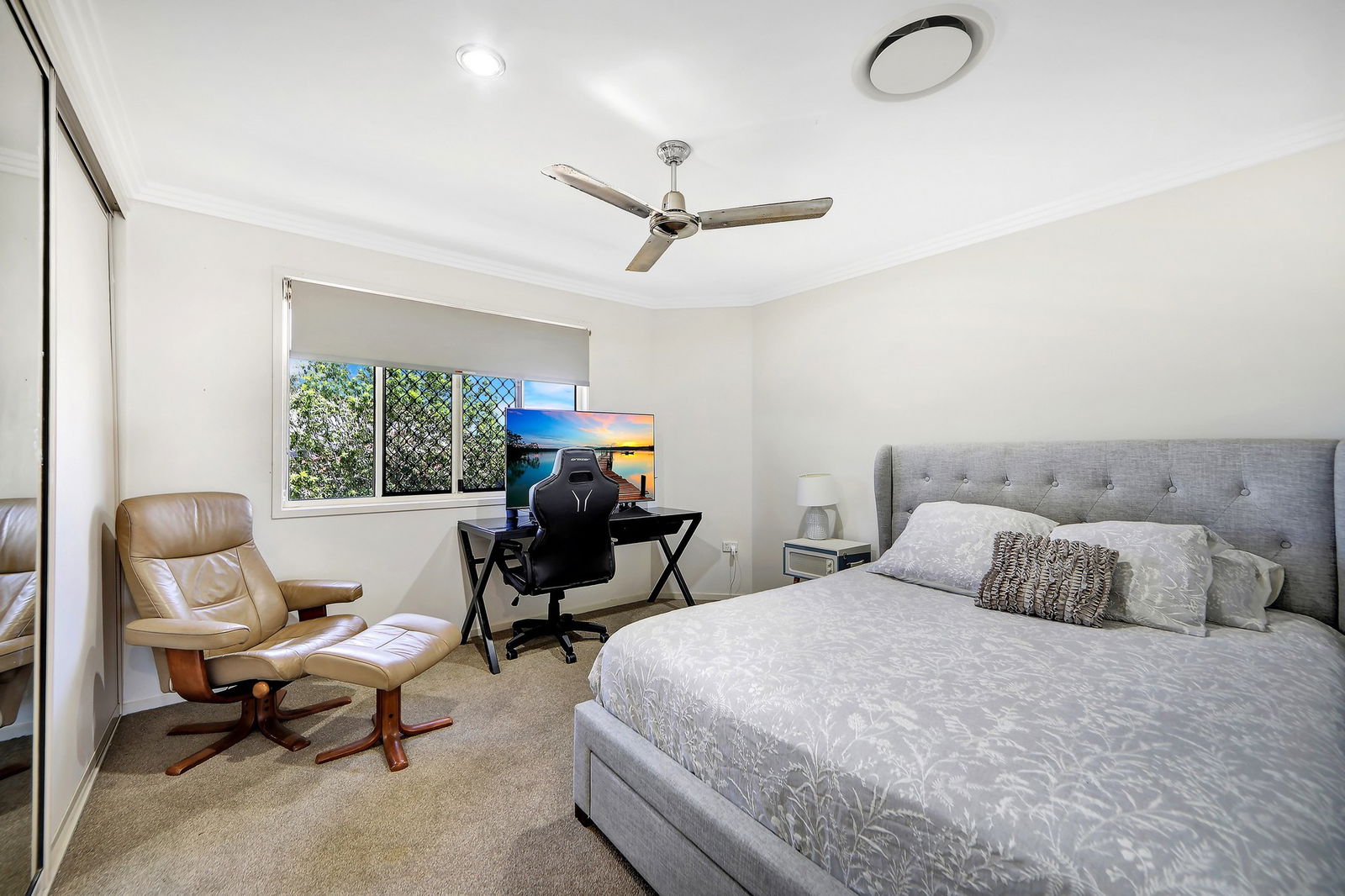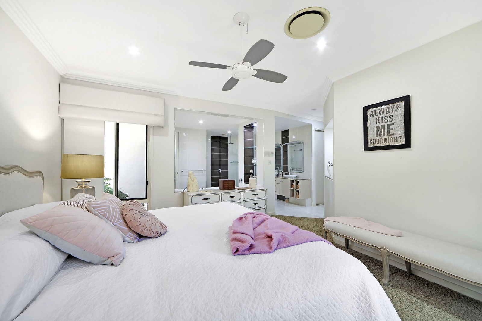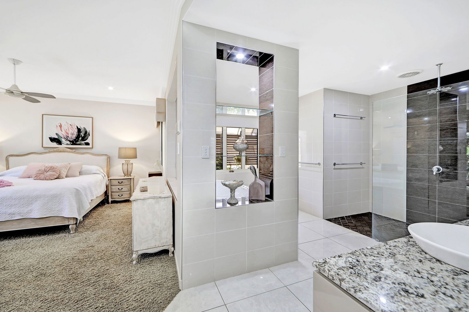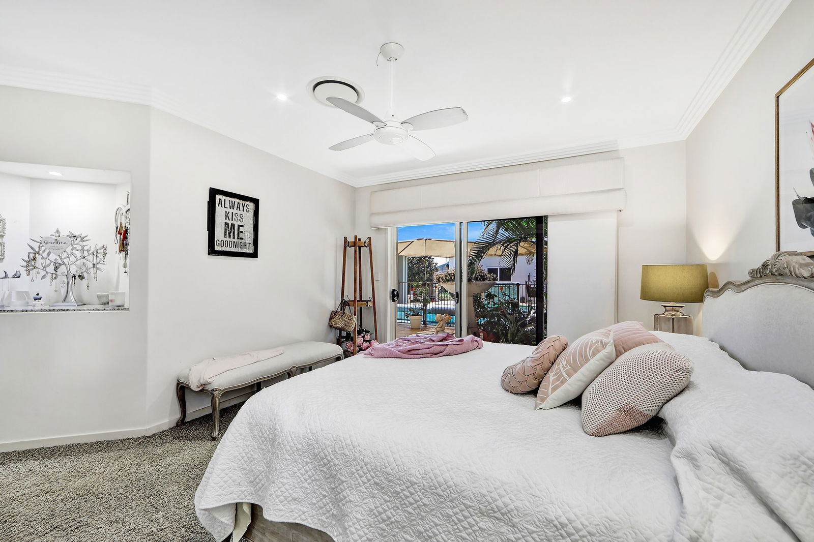 - Main bedroom privately positioned with pool views, generous proportions, walk-in wardrobe and an ensuite.
