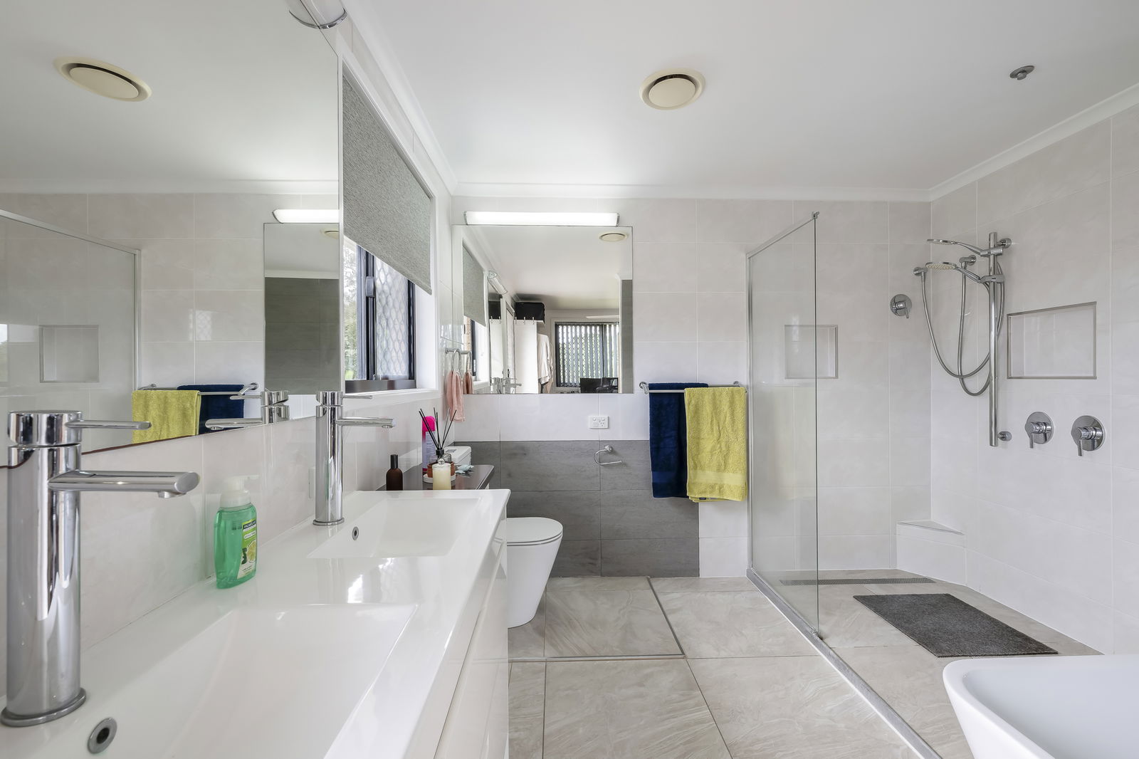 - Main bathroom with shower, vanity, and separate toilet.