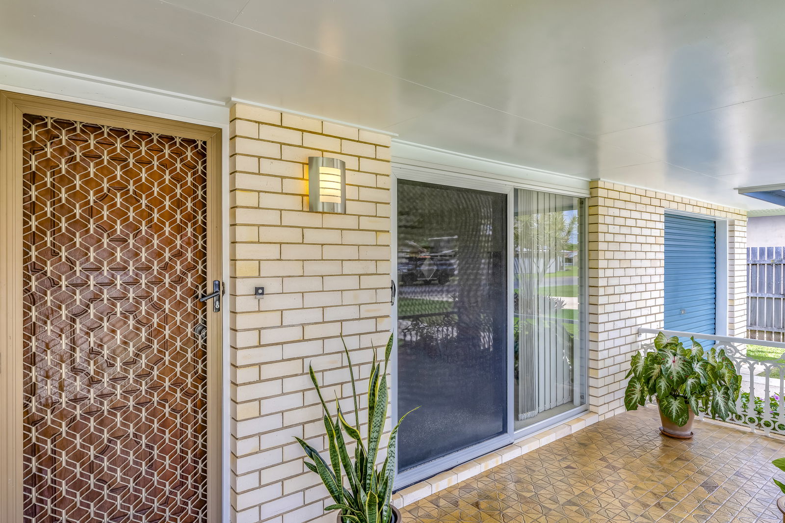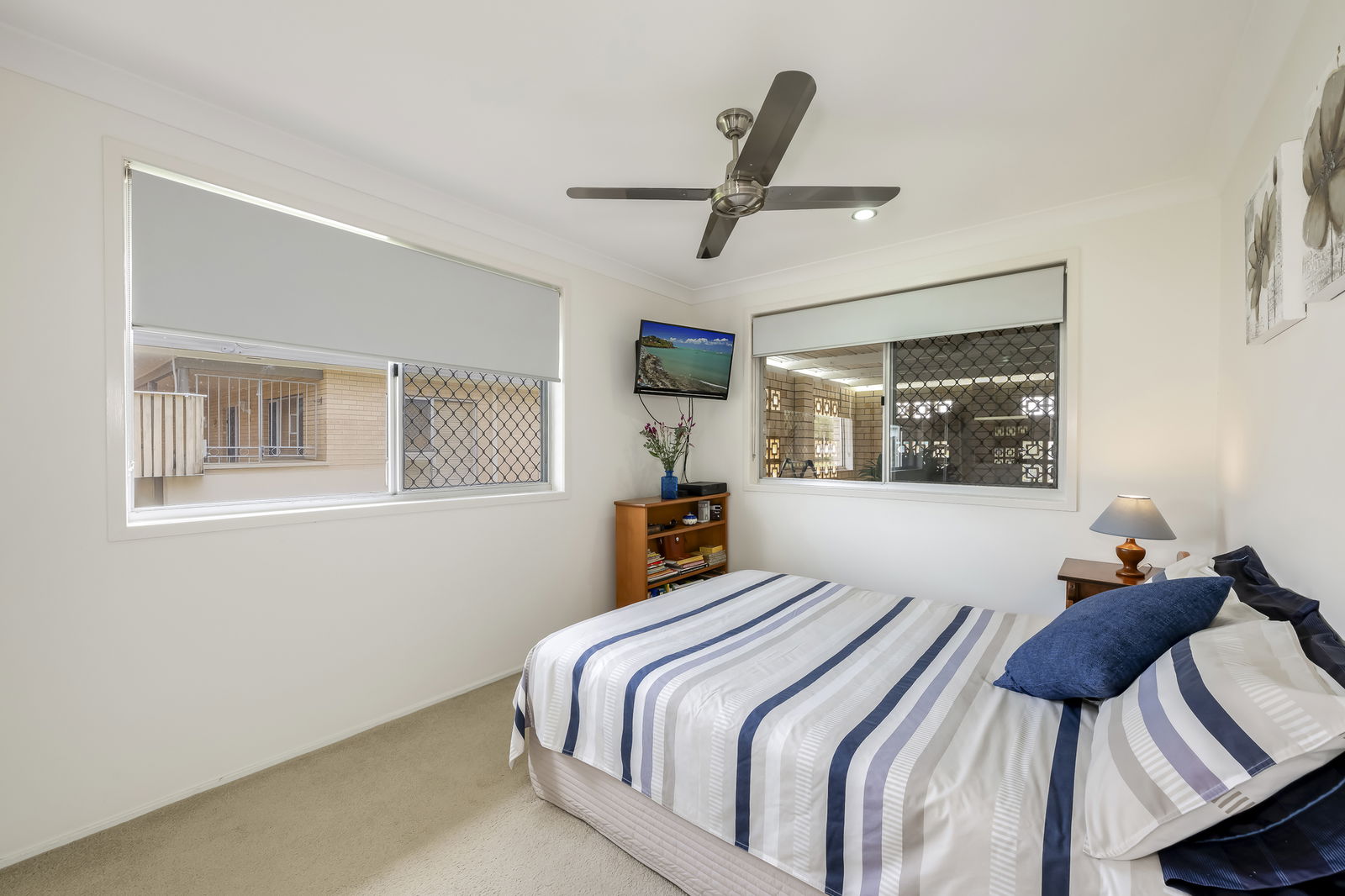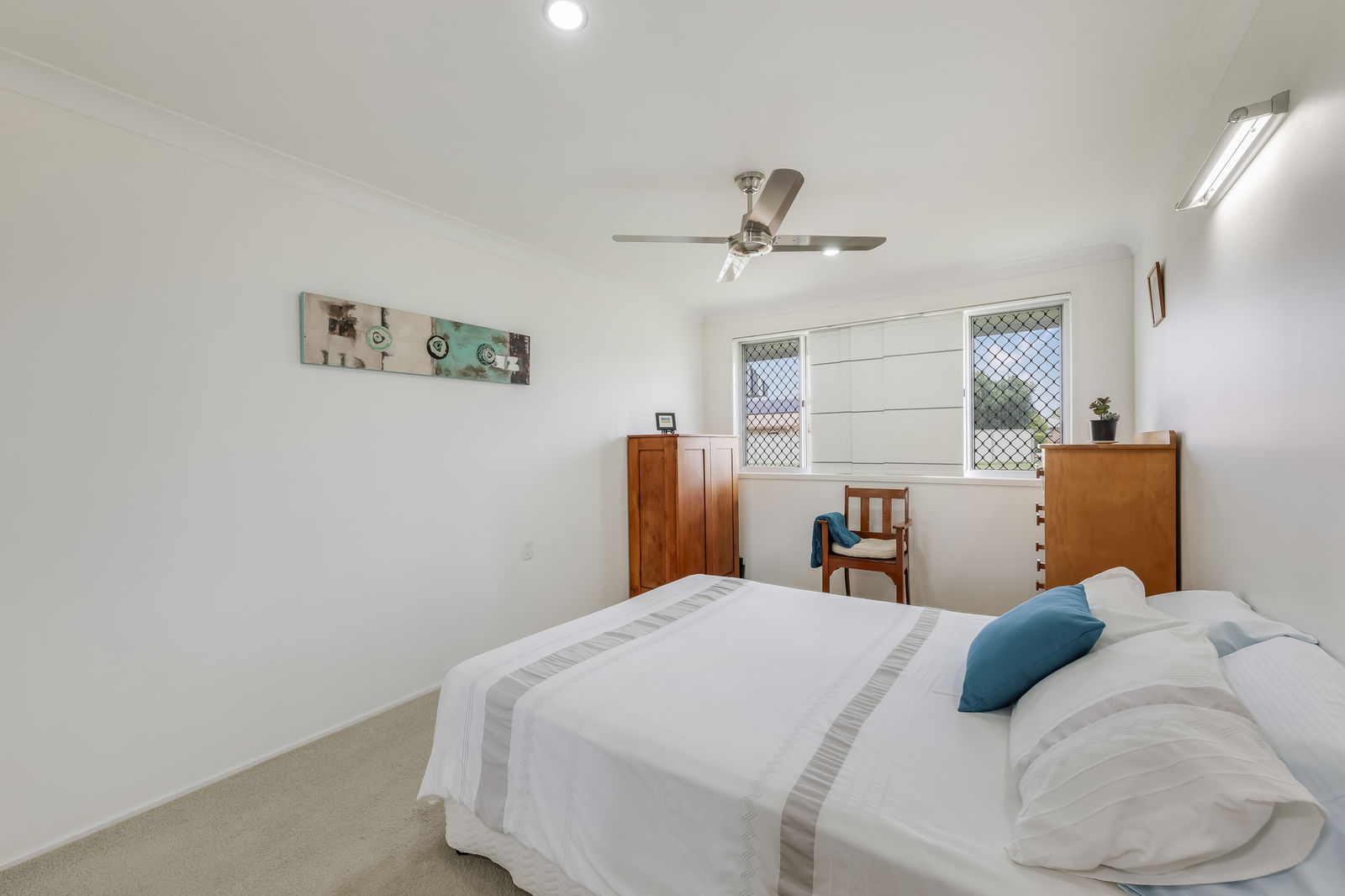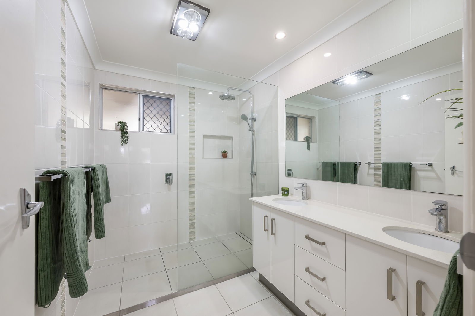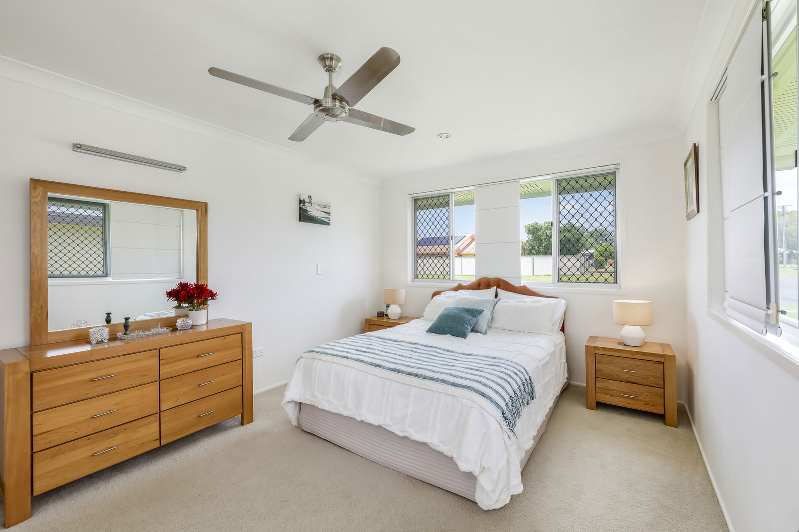 Down the hallway, three well-appointed bedrooms await, each featuring plush carpeting, mirrored built-in wardrobes, and stainless steel ceiling fans. The master bedroom stands out with a built-in emergency fire escape for added peace of mind, and security screens throughout the home ensure comfort and safety. The fully renovated main bathroom boasts floor to ceiling tiles, a double vanity, a spacious walk-in shower with rainfall and handheld fixtures, and a storage niche for toiletries.