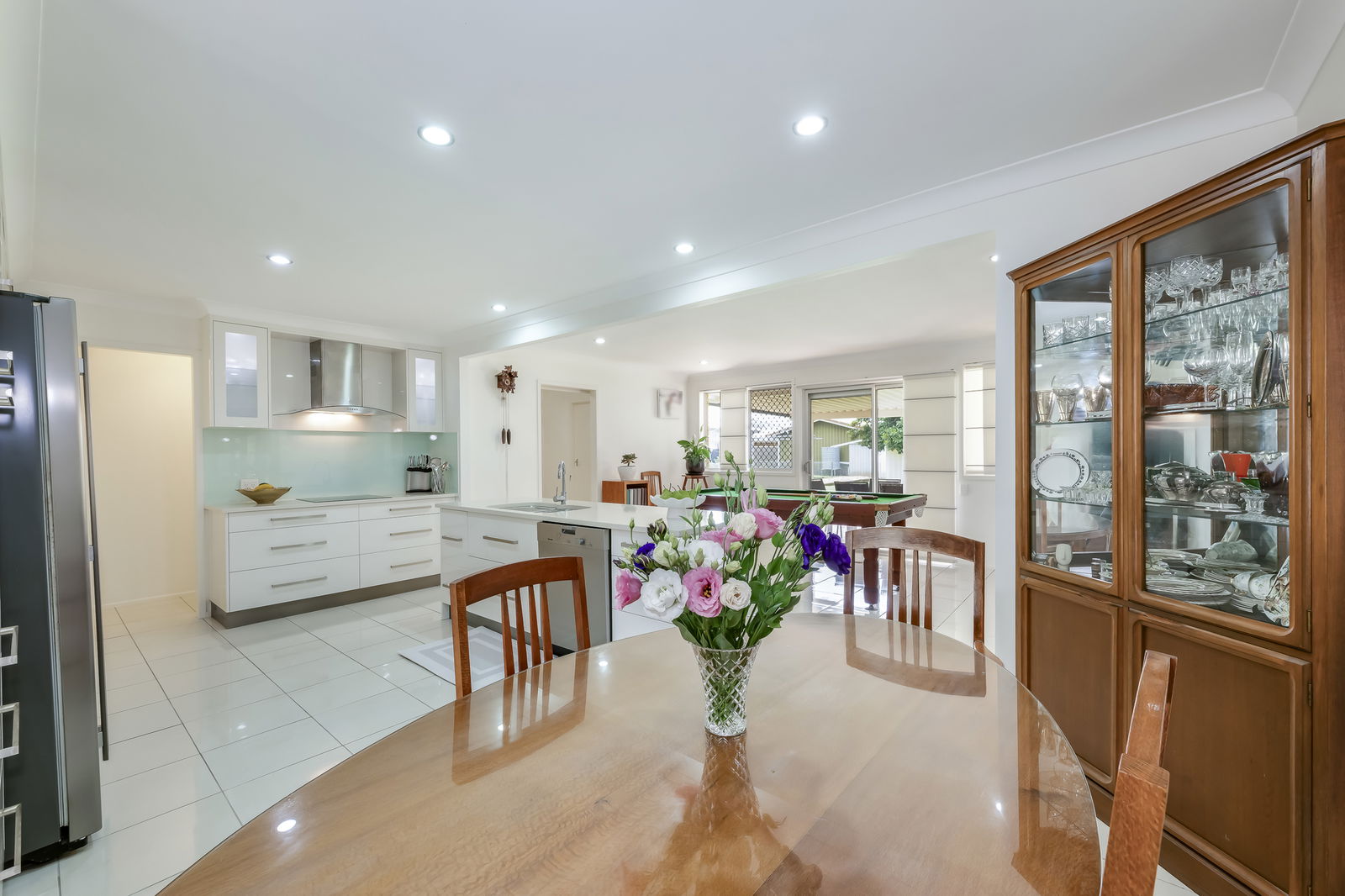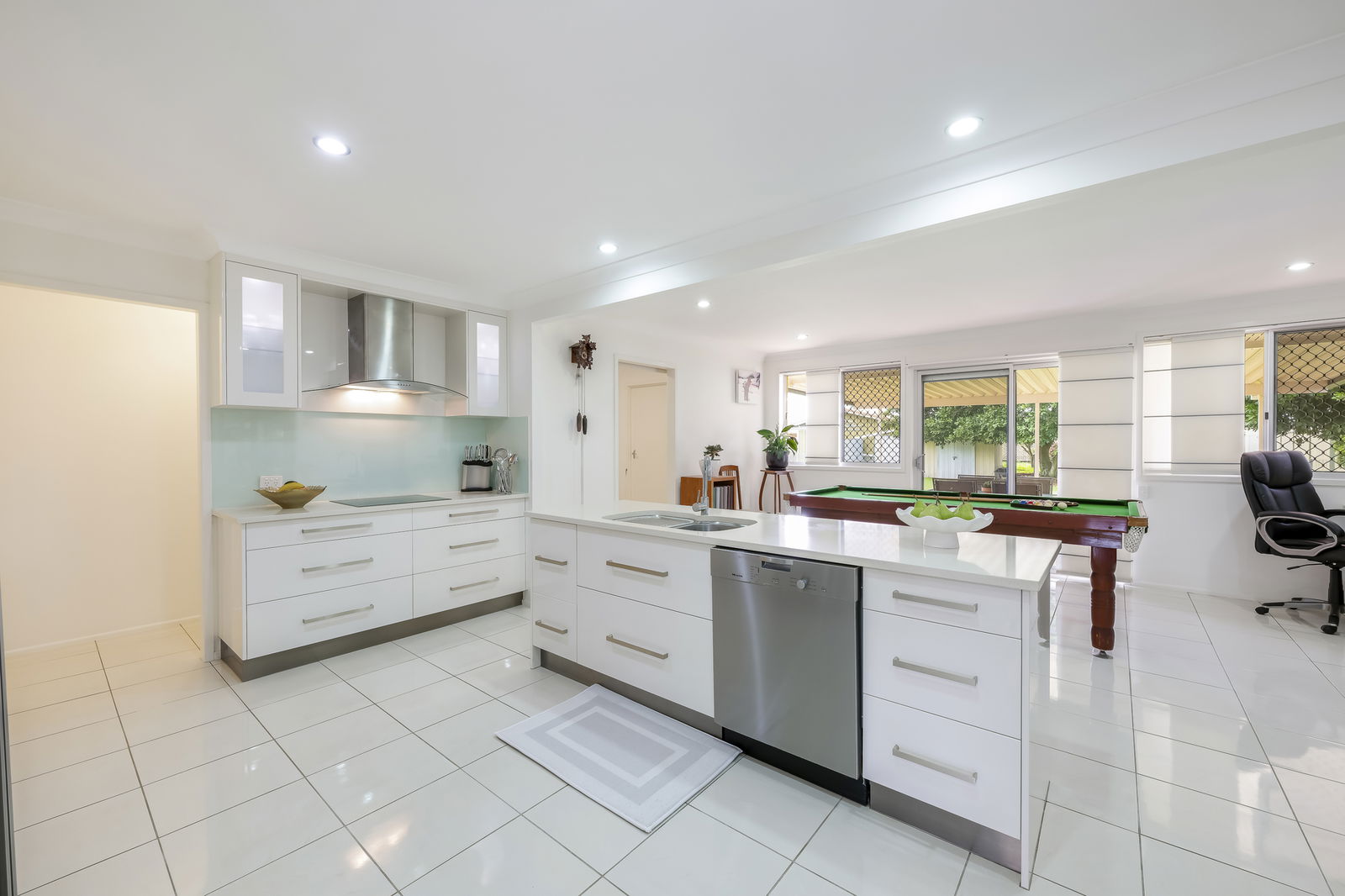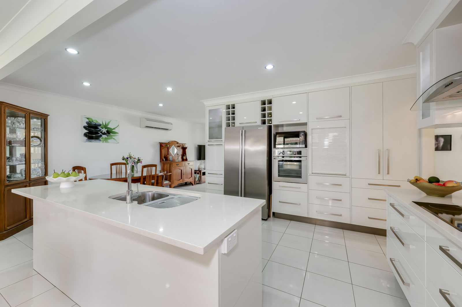 At the heart of the home, the kitchen is a true showstopper. Expansive in size and exquisitely detailed, it features full height soft close drawers, stainless steel appliances, and a full-burn electric cooktop. The central island bench includes a double sink and generous workspace, alongside a double-bay space for a large fridge, offering convenience and functionality. A clever pull down breakfast bar conceals small appliances like your toaster and kettle neatly behind cabinetry, keeping benchtops clean and uncluttered. Overhead cabinets with integrated lighting illuminate the space, glass splashbacks add elegance, and pull-out cabinetry ensures everything is accessible. With its layout and generous size, this kitchen is perfect for cooking, daily living, and entertaining, combining practicality with high end design.