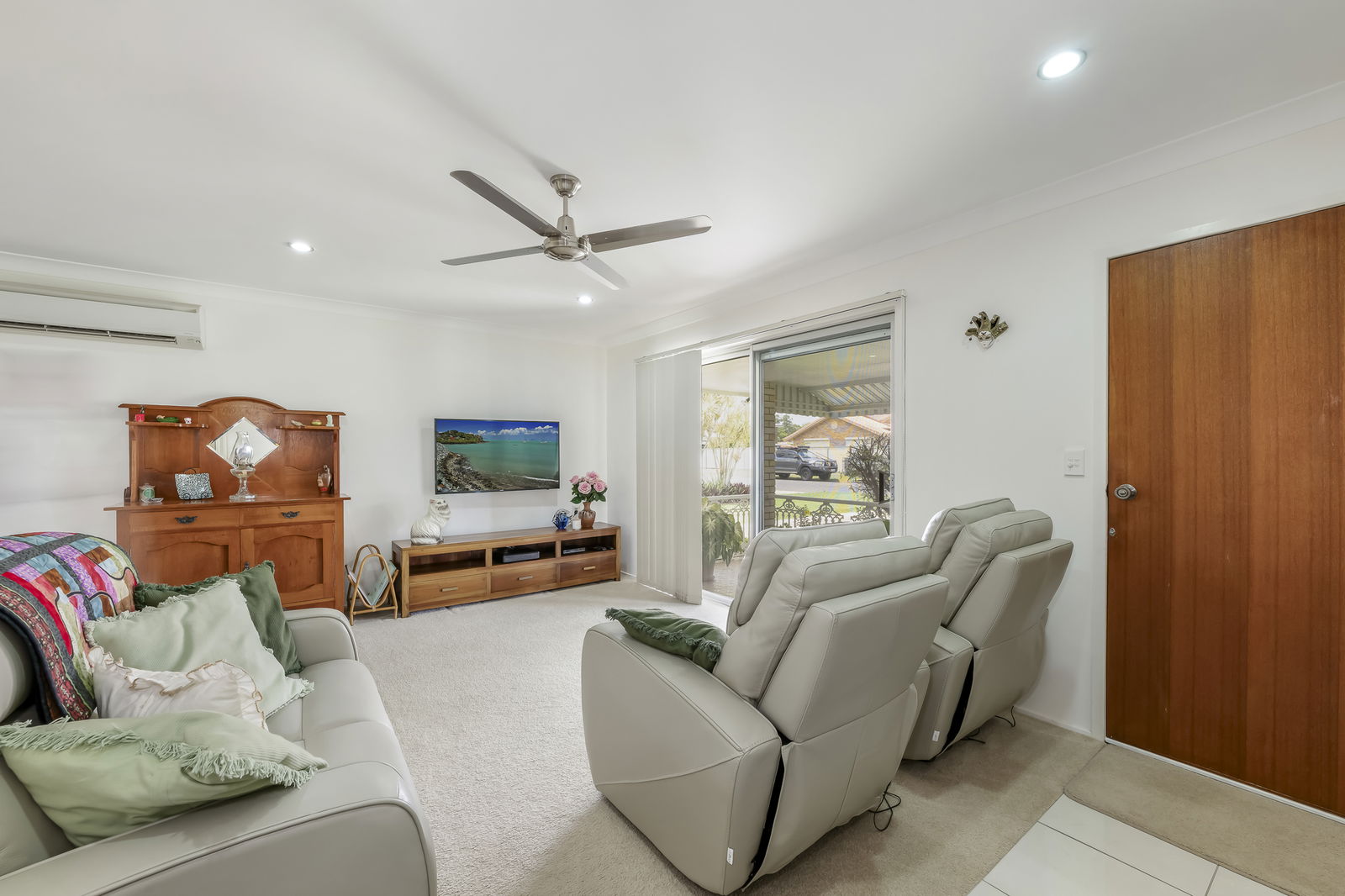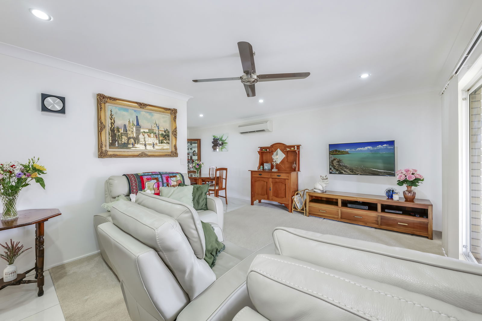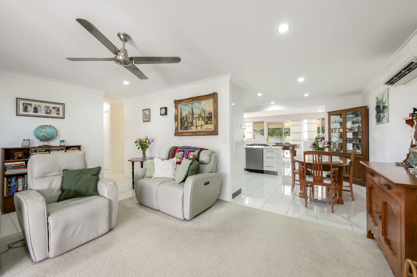 Stepping inside, you're greeted by a graceful flow of open plan living, dining, and kitchen merge seamlessly, with an additional living zone offering flexibility as a family room, games zone, or second lounge. The lounge features plush carpeting, stainless-steel ceiling fans, and air-conditioning for year-round comfort, with double sliding doors opening to the inviting front patio.