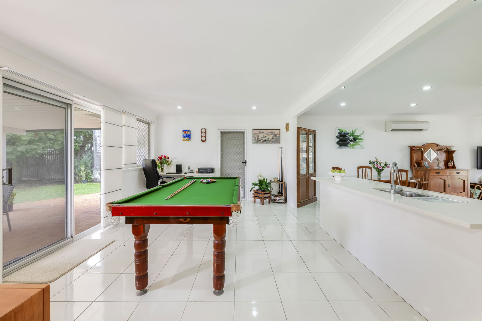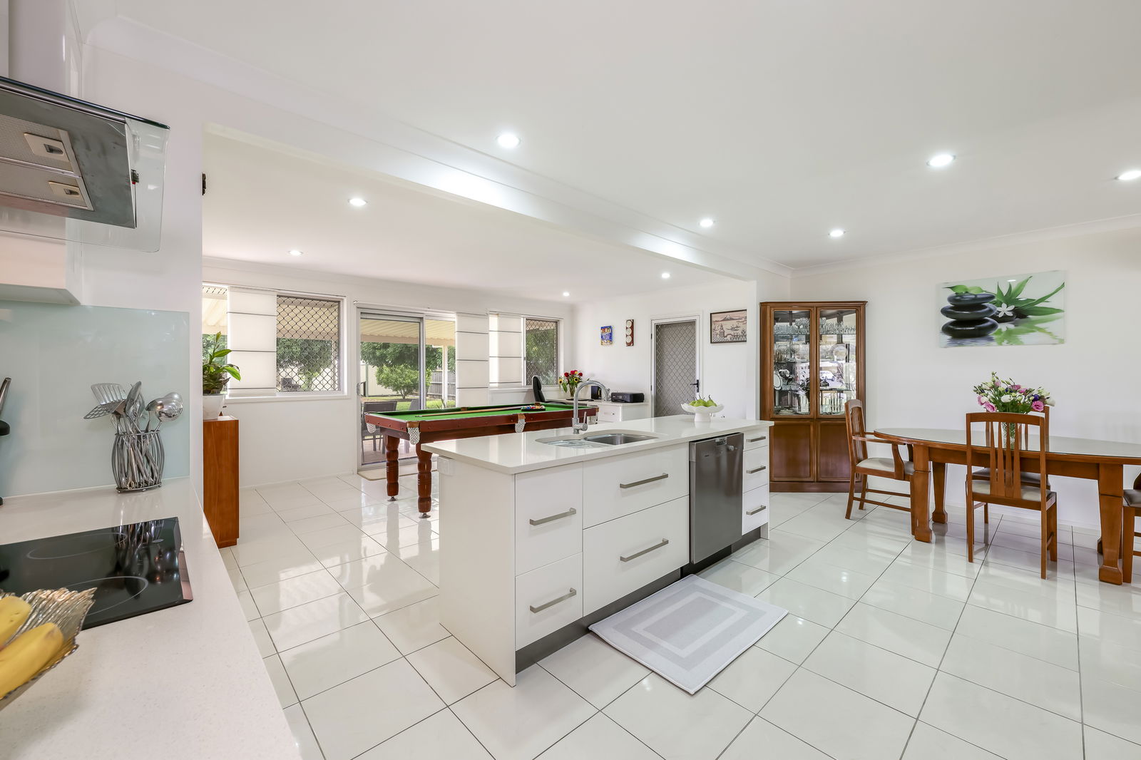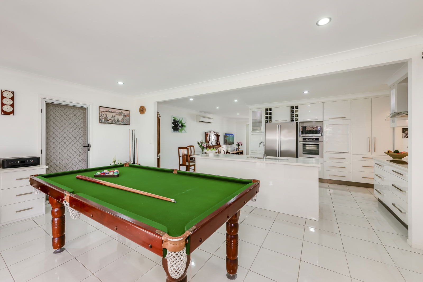 Stepping inside, you're greeted by a graceful flow of open plan living, dining, and kitchen merge seamlessly, with an additional living zone offering flexibility as a family room, games zone, or second lounge. The lounge features plush carpeting, stainless-steel ceiling fans, and air-conditioning for year-round comfort, with double sliding doors opening to the inviting front patio.