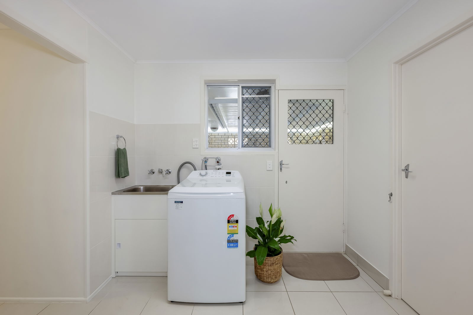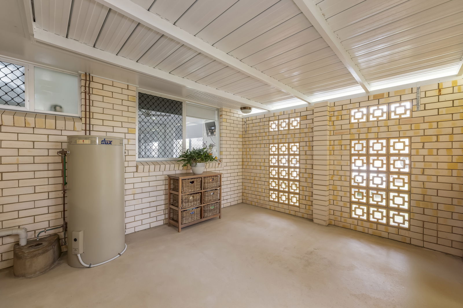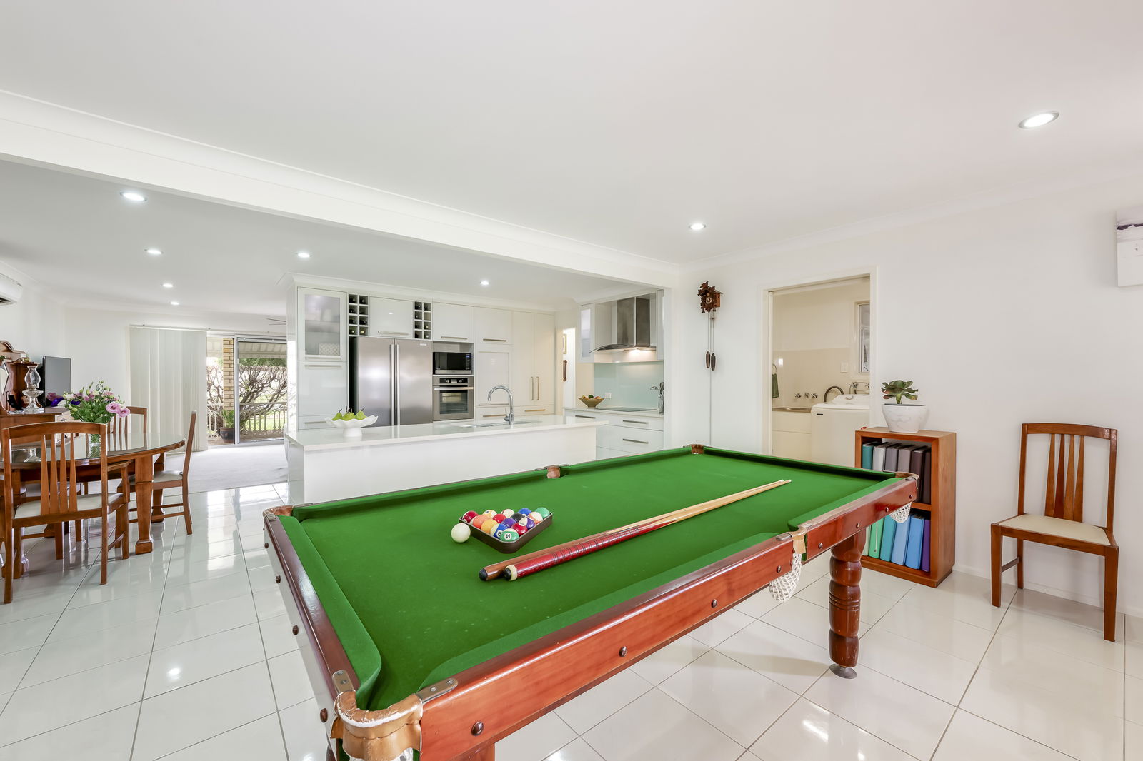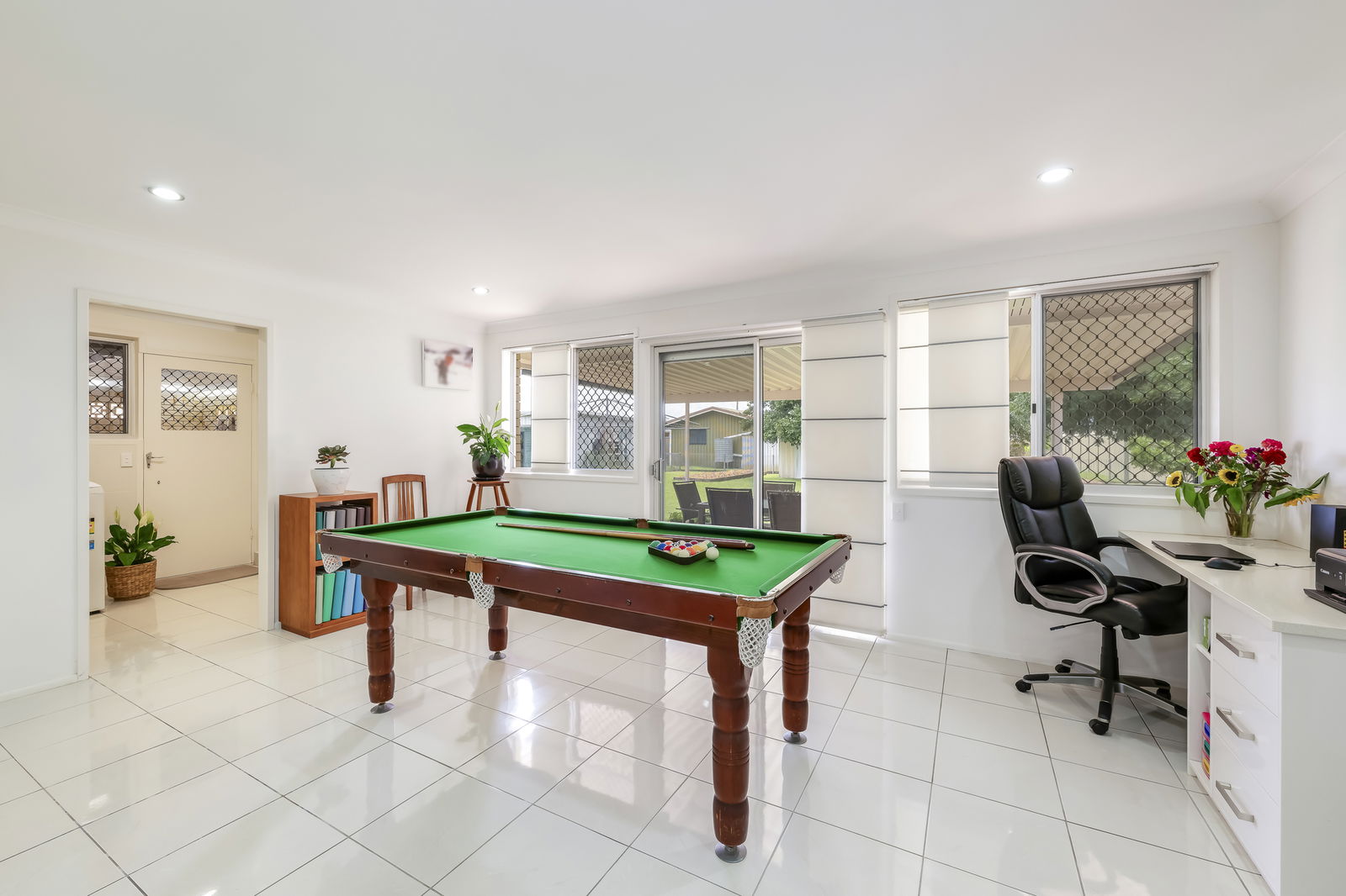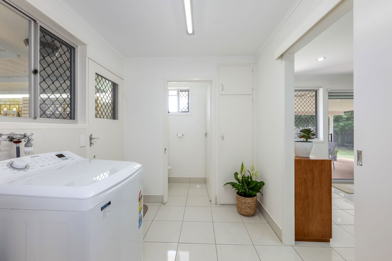 From the kitchen, a built-in study nook provides an ideal workspace, while the full-sized laundry connects to a versatile outdoor area, perfect for clothes drying, additional seating, or even converting into a small greenhouse.